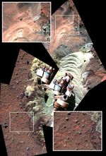 The brightness and color of the freshly disturbed soil seen in the center area of the mosaic indicates the this formerly hidden material is sulfate-rich. Before Spirit drove into this patch, the surface looked like the undisturbed ground highlighted in the lower-right inset. Flecks of red material in the surface layer resemble the appearance of the surface layer at other locations where Spirit's wheels have exposed high-sulfate, bright soils.
