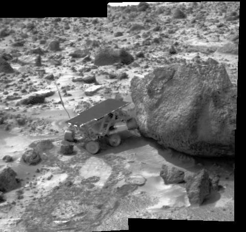 Sojourner has made contact with the rock "Yogi" in this image, taken with the Imager for Mars Pathfinder (IMP) at 8:45 p.m. PDT on Sol 6. The rover's left rear wheel has driven up onto the Yogi's surface in an attempt to get as close as possible to the rock's surface. Sojourner will later use its Alpha Proton X-Ray Spectrometer (APXS) instrument to conduct a study of Yogi's chemical composition.