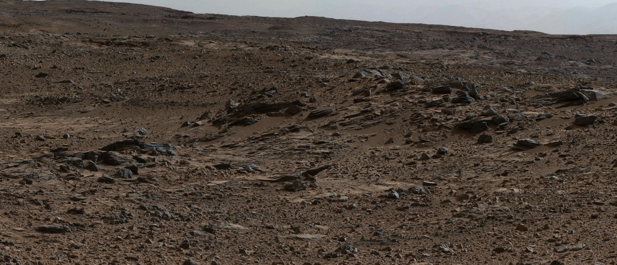 This image from the Mast Camera (Mastcam) on NASA's Curiosity Mars rover shows inclined strata at "Zabriskie Plateau," about a third of a mile (half a kilometer) northeast of the "Pahrump Hills" outcrop at the base of Mount Sharp. The view looks to the west.