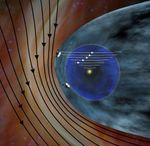 This artist's concept shows the different expected directions of the magnetic fields in interstellar space (black lines) and the magnetic field emanating from our sun (white lines). NASA's Voyager 1 spacecraft is traveling northward out of the heliosphere, which is the bubble of charged particles the sun blows around itself. Voyager 2 is traveling southward out of the heliosphere.