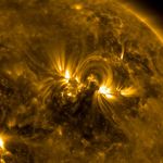 The magnetic field lines between a pair of active regions formed a beautiful set of swaying arches rising up above them (Apr. 24-26, 2017). The connection between opposing poles of polarity is visible in exquisite detail in this wavelength of extreme ultraviolet light. What we are really seeing are charged particles spinning along the magnetic field lines. Other field lines are traced as they reach out in other directions as well. The video covers almost two days of activity.