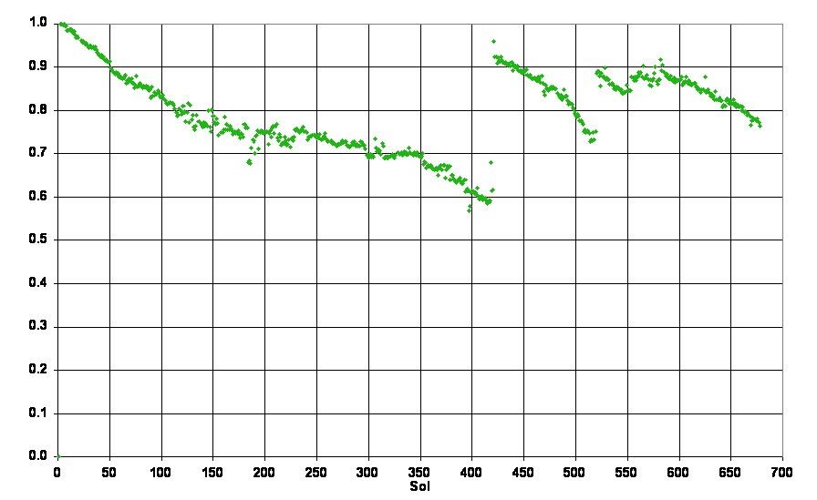 This graph shows the effects of those panel-cleaning events on the amount of electricity generated by Spirit's solar panels. The horizontal scale is the number of Martian days (sols) after Spirit's Jan. 4, 2005, (Universal Time) landing on Mars. The vertical scale indicates output from the rover's solar panels as a fraction of the amount produced when the clean panels first opened. Note that the gradual declines are interrupted by occasional sharp increases, such as a dust-cleaning event on sol 420.