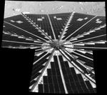 Shown here is one of the first images taken by NASA's Phoenix Mars Lander of one of the octagonal solar panels, which opened like two handheld, collapsible fans on either side of the spacecraft. Beyond this view is a small slice of the north polar terrain of Mars.