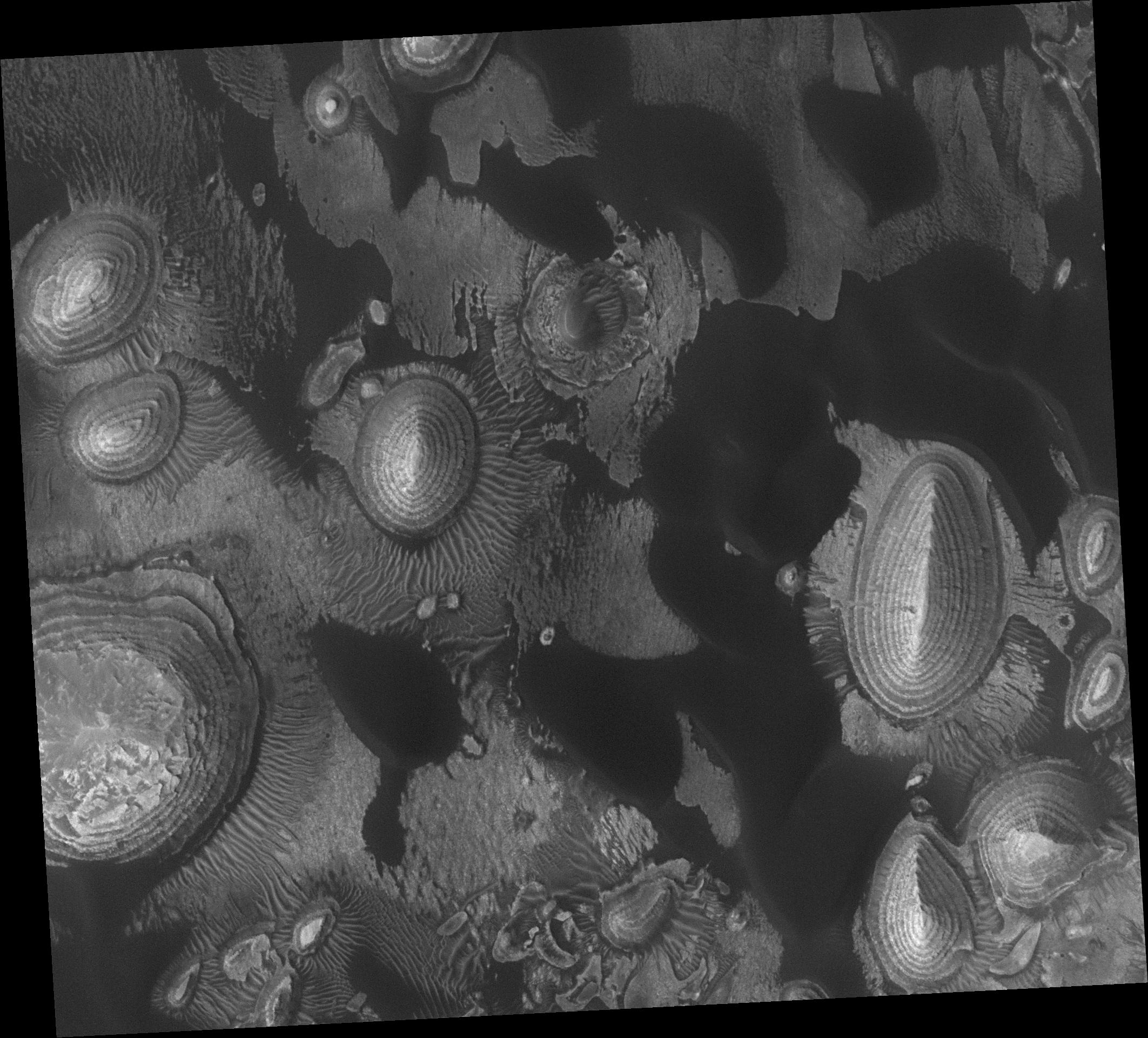 New are the dark-toned sand dunes and intermediate-toned ripples. The dark dunes were formed of sand that in relatively recent times has been blown by wind from the northeast (upper right) toward the southwest (lower left). The dunes have slowly encroached upon the older, light-toned, layered mounds. Surrounding each mound is a suite of intermediate-toned ripples. These are large ripples, relative to counterparts on Earth, and are most likely made up of grains somewhat coarser than sand, typically of several millimeters in size. The ripples form a pattern that is generally radial to each mound, indicating that they formed in winds that interacted with these topographic obstacles. The dark dunes are generally younger than the ripples, as dark sand has encroached upon and over-ridden some of the ripples.