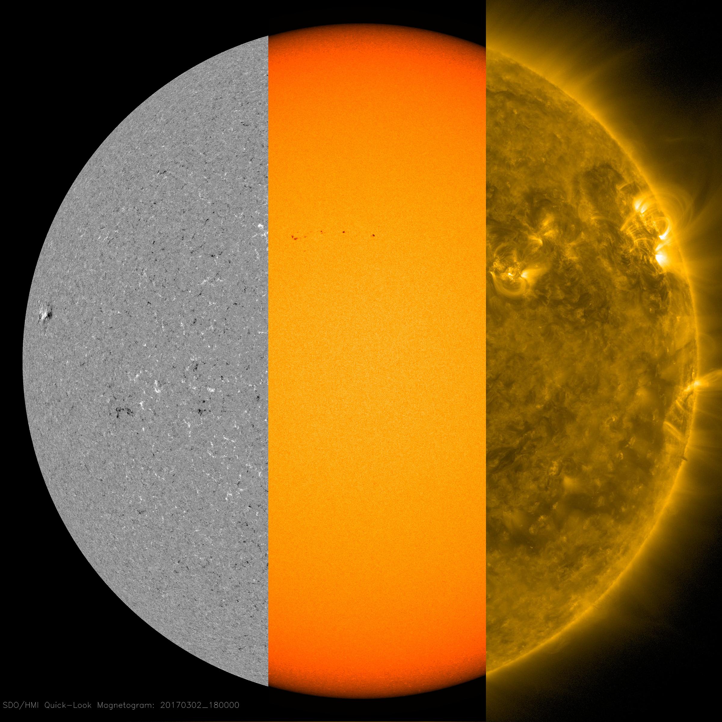 Several small sunspots appeared this week, giving us a chance to illustrate their sources (Mar. 2, 2017). The first image is a magnetogram or magnetic image of the sun's surface. The MDI instrument can observe where positive and negative particles are moving toward or away from strong magnetic areas. These active regions have stronger magnetic fields and appear as strongly black or white. The yellow image shows the surface in filtered light, and there the same active regions appear as dark, cooler splotches called sunspots. Higher up in the sun's atmosphere, the golden image (in extreme ultraviolet light) shows arches of light above the active regions, which are charged particles spinning along magnetic field lines. Note that they all align very well with each other. Magnetic forces are the dynamic drivers here in these regions of the sun.