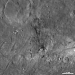 This Dawn Framing Camera (FC) image of Vesta shows Sossia crater, which is the crater partially surrounded by dark material near the bottom of the image. Sossia crater has a reasonably fresh rim and patches of dark material cropping out around part of this rim. This dark material spreads away from the rim of the crater and slumps down into the center of the crater. There is also an area of dark material associated with a smaller crater below Sossia's rim. This smaller crater is almost completely filled by dark material. A much smaller amount of bright material also crops out from Sossia's rim. Surrounding Sossia crater is the undulating terrain of Vesta's southern hemisphere, which consists of curvilinear ridges and grooves.