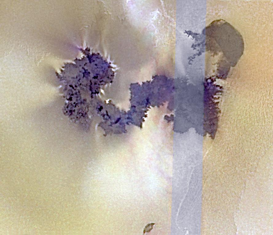 Some clues are offered by this false-color picture with a resolution of 170 meters (186 yards) per picture element, which was taken by Galileo on February 22, 2000. To the right is a dark, semi-circular, lava-filled caldera. South of it lies a fissure from which dark lava has flowed toward the west (left). The lava flow extends 90 kilometers (54 miles) from the source. Bright patches probably composed of sulfur dioxide can be seen in several places along the flow's margins. Two of these patches (near the top left edge of the dark lava, at the farthest reaches of the flow) display faint blue hazes, apparently produced by airborne dust entrained within plumes. Both of these spots are locations of newly erupted lava that has encroached on the surrounding plains since Galileo last imaged the region in October 1999. Galileo scientists are now studying whether heating of the volatile, sulfur dioxide-rich plains by encroaching hot lava might account for the persistent plume activity observed near Prometheus.