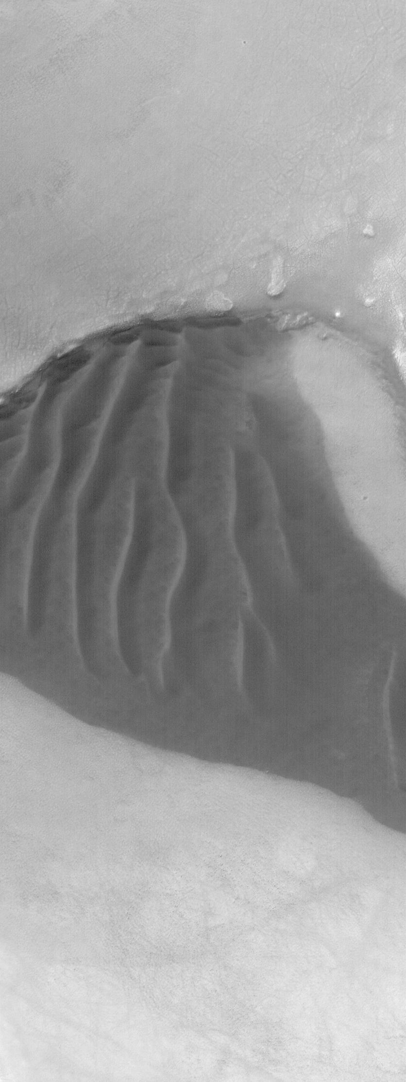 This Mars Global Surveyor (MGS) Mars Orbiter Camera (MOC) image shows a small patch of dark, windblown sand in the martian south polar region. Throughout the south high latitudes, dark sand has been trapped by wind in craters, pits, and depressions. This example is located near 64.5°S, 9.5°W. The image covers an area about 3 km (1.9 mi) across. Sunlight illuminates the scene from the upper left.