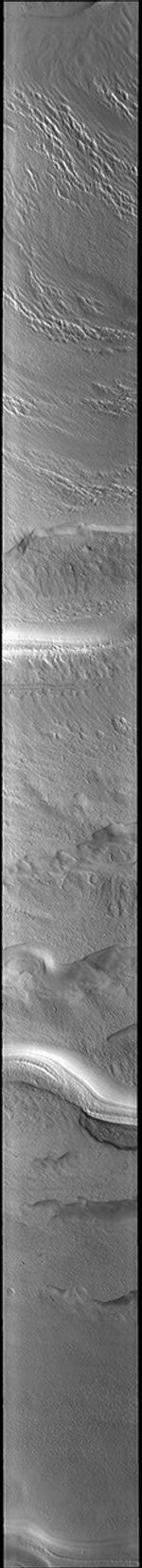 Today's VIS image shows part of the south polar cap. This image was taken at the start of southern summer, and the surface frost has sublimated away. The cap was created over millions of years with deposition of ice and dust during different seasons, creating layers. The ice surface contains several different textures which can be seen in this image. The south polar cap is called Australe Planum.