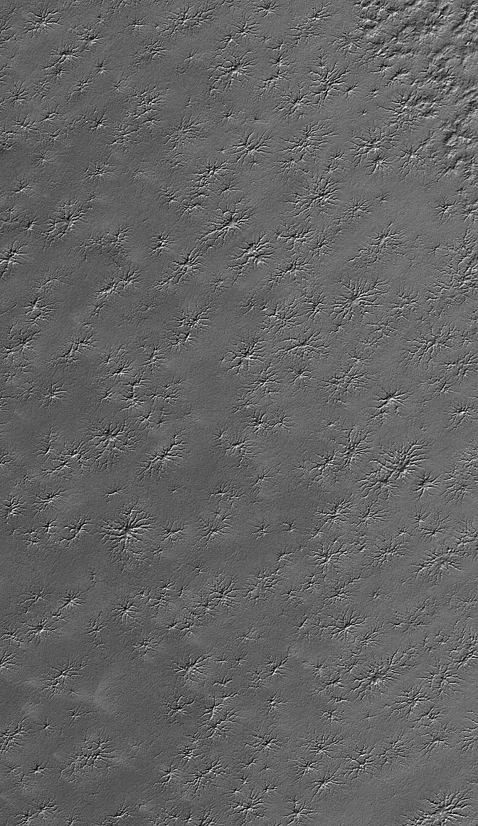 This Mars Global Surveyor (MGS) Mars Orbiter Camera (MOC) image shows an area adjacent to the south polar residual cap that hosts several intricate fracture networks. Each network consists of multiple fractures radiating from a central location. Their origin is not understood -- some investigators have speculated that these are sites of release of carbon dioxide from beneath the ground, but this explanation seems inadequate to explain all attributes of the features. MOC images have shown that these features have not been changing from year to year during the course of the MGS mission.