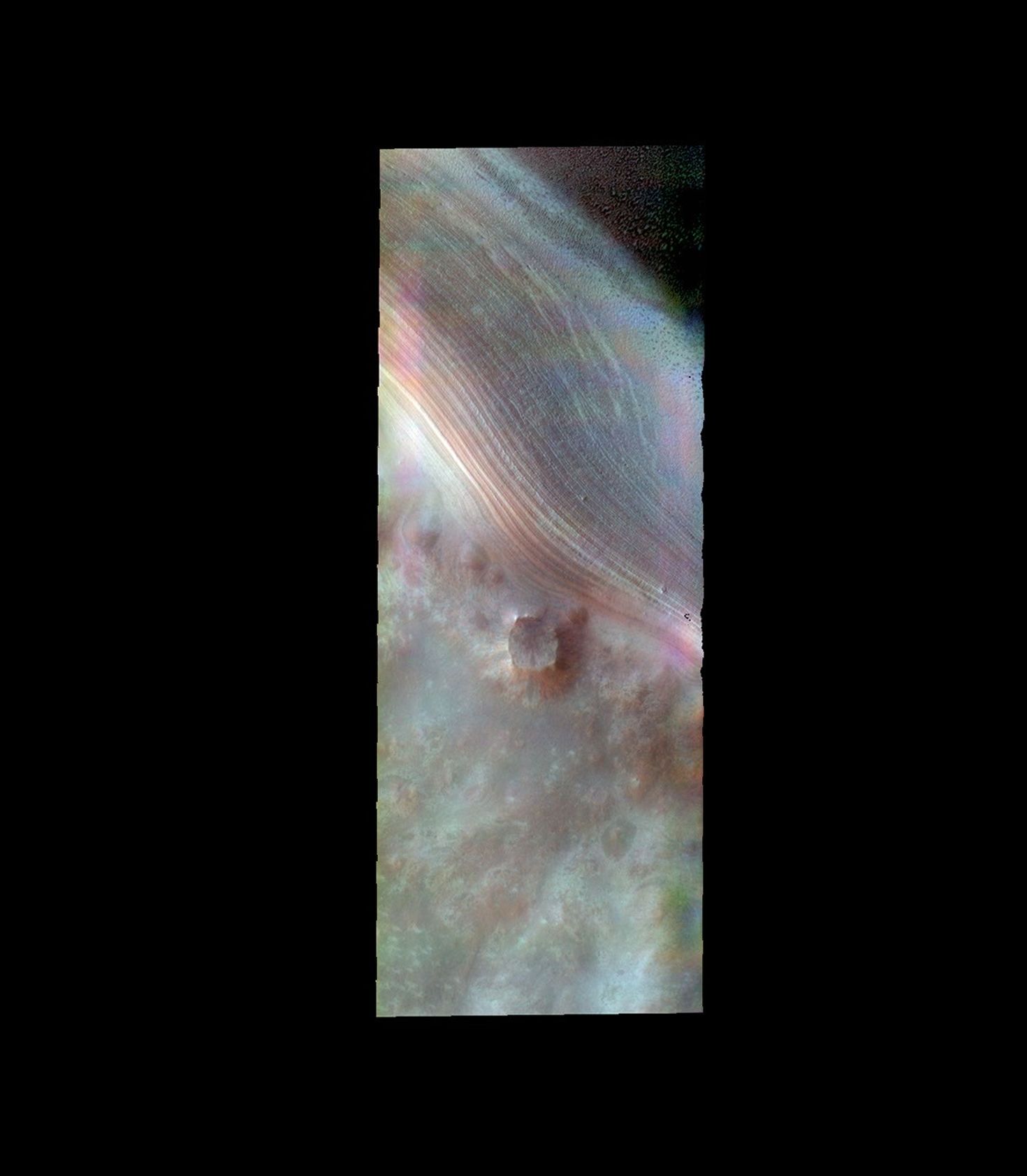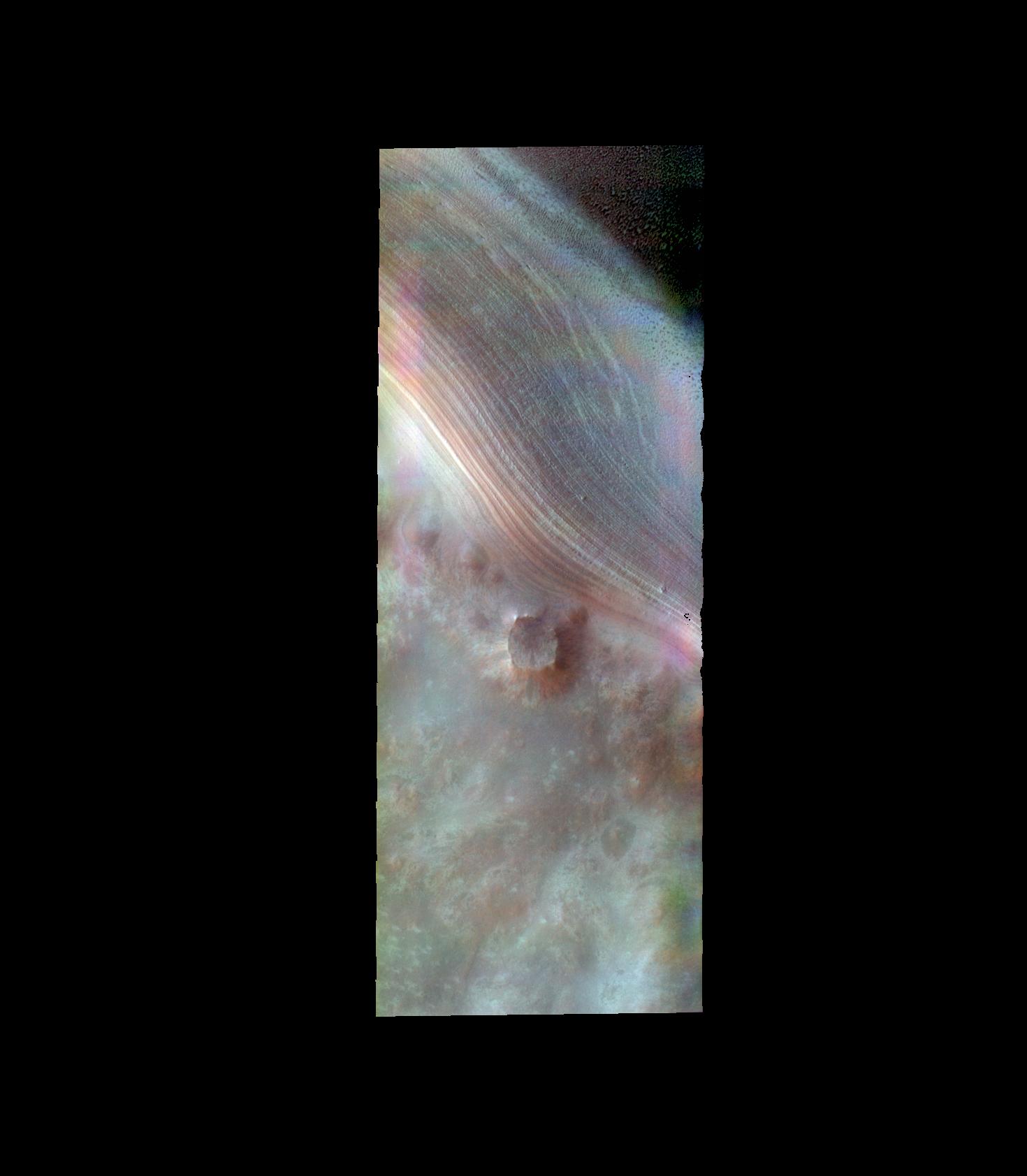 The THEMIS VIS camera contains 5 filters. The data from different filters can be combined in multiple ways to create a false color image. These false color images may reveal subtle variations of the surface not easily identified in a single band image. Today's false color image shows the margin of the polar cap in Promethei Chasma. The layering of the ice is seen in the top half of the image.