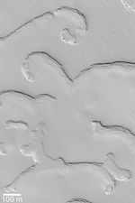 Have you ever stared up at the clouds in the sky and seen the shapes of animals, people, or objects? Sometimes when the Mars Global Surveyor (MGS) Mars Orbiter Camera (MOC) team is looking at newly-returned pictures from Mars, the same thing happens. This is a picture of pits and scarps in the frozen south polar carbon dioxide ice cap. Sunlight illuminates the scene from the upper right. At the bottom of the picture is a feature that resembles a long, thin poodle; its head faces to the left, the tail to the right. This picture is located near 86.9°S, 55.8°W.