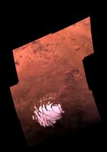 This mosaic is composed of 18 Viking Orbiter images (6 each in red, green, and violet filters), acquired on September 28, 1977, during revolution 407 of Viking Orbiter 2. The south pole is located just off the lower left edge of the polar cap, and the 0 degree longitude meridian extends toward the top of the mosaic. The large crater near the right edge (named "South") is about 100 km in diameter. These images were acquired during southern summer on Mars (Ls = 341 degrees); the sub-solar declination was 8 degrees S., and the south polar cap was nearing its final stage of retreat just prior to vernal equinox. The south residual cap is approximately 400 km across, and the exposed surface is thought to consist dominantly of carbon-dioxide frost. This is in contrast to the water-ice surface of the north polar residual cap. It is likely that water ice is present in layers that underlie the south polar cap and that comprise the surrounding layered terrains. Near the top of this image, irregular pits with sharp-rimmed cliffs appear "etched," presumably by wind. A series of rugged mountains (extending toward the upper right corner of the image) are of unknown origin.