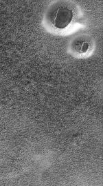 This Mars Global Surveyor (MGS) Mars Orbiter Camera (MOC) image shows two circular features in the south polar region of Mars. The circular features are degraded impact craters. The dark, irregular features in each crater are the remnants of a layer of material that probably once covered the entire scene, before being eroded away. All of the terrain in this image is covered by defrosting, seasonal carbon dioxide frost.