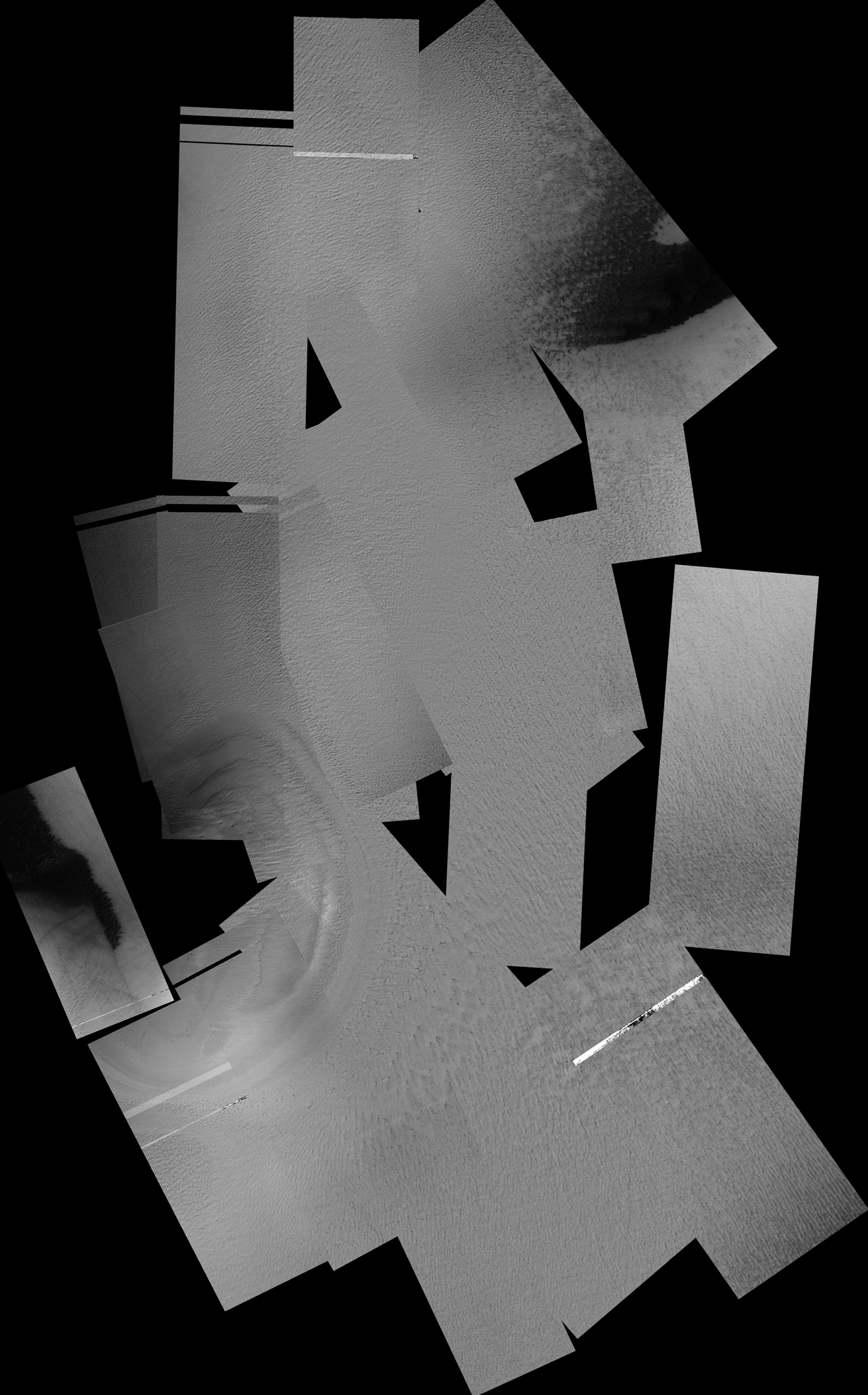 The data acquired by the Mars Global Surveyor (MGS) Mars Orbiter Camera (MOC) during the period between September 1999 and February 2000--now available for viewing in the MGS MOC GALLERY--include hundreds of pictures taken in support of the Mars Polar Lander mission before and after the attempted landing. Repeated efforts to find the lost lander during December 1999 and January - February 2000 resulted in several overlapping pictures taken from different angles as the spacecraft was pointed off its usual nadir--looking straight down--imaging position. Pictures such as these are perfect for 3-D, or, stereo, viewing. The context image on the right shows, at 20 meters (66 ft) per pixel, the mosaic of MOC images obtained to search for the lost lander. The four small white boxes show the locations of 3D views in the picture on the left. To view these in stereo, you need red-blue 3D glasses (red filter over left eye, blue over right). Each stereo (3-D) image covers an area approximately 750 by 750 meters (about 1/2 a mile on a side). The terrain appears to be rugged, but the cause of this relief is unknown. Perhaps wind and frost have shaped this landscape. The Mars Polar Lander was lost during descent on December 3, 1999. Its location was not found in the MOC images (finding the lander would have been very difficult, because it is so small--smaller than a Volkswagen "Beetle"--and the camera was not really designed to see things that small; see Mars Polar Lander: The Search Begins). These images are located near 76.3°S, 195.0°W. North is toward the top and illumination is from the upper left. For scale, two small squares in each 3-D image are 10 m on a side, 40 m apart horizontally, and 10 m apart vertically (10 m = 10.9 yards; 40 m = 47.3 yards).