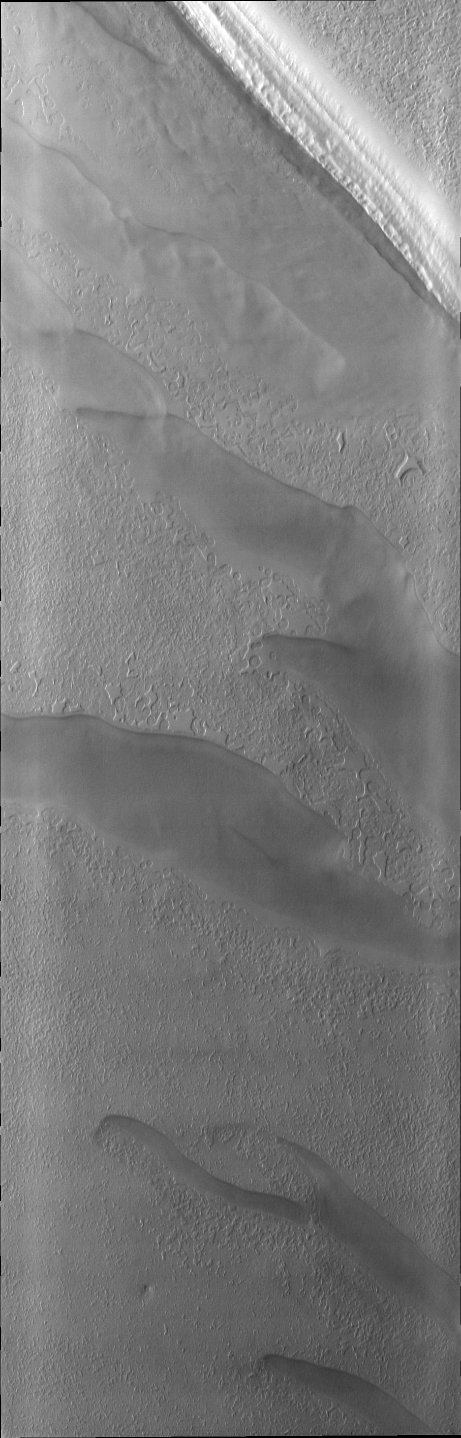 As spring progresses at the south pole, the surface reacts to the change of season. Today's VIS image shows a region of the south pole that is monitored throughout spring, summer, and fall at the south pole.