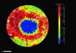 NASA's 2001 Mars Odyssey spacecraft provided this view of the south pole of Mars in intermediate-energy, or epithermal, neutrons. Soil enriched in hydrogen is indicated by the deep blue colors on the map, where a low intensity of epithermal neutrons is found. The view shown here of the south pole of Mars comes from measurements made during the first week of Mars Odyssey's mapping, in February 2002, using the neutron spectrometer instrument.