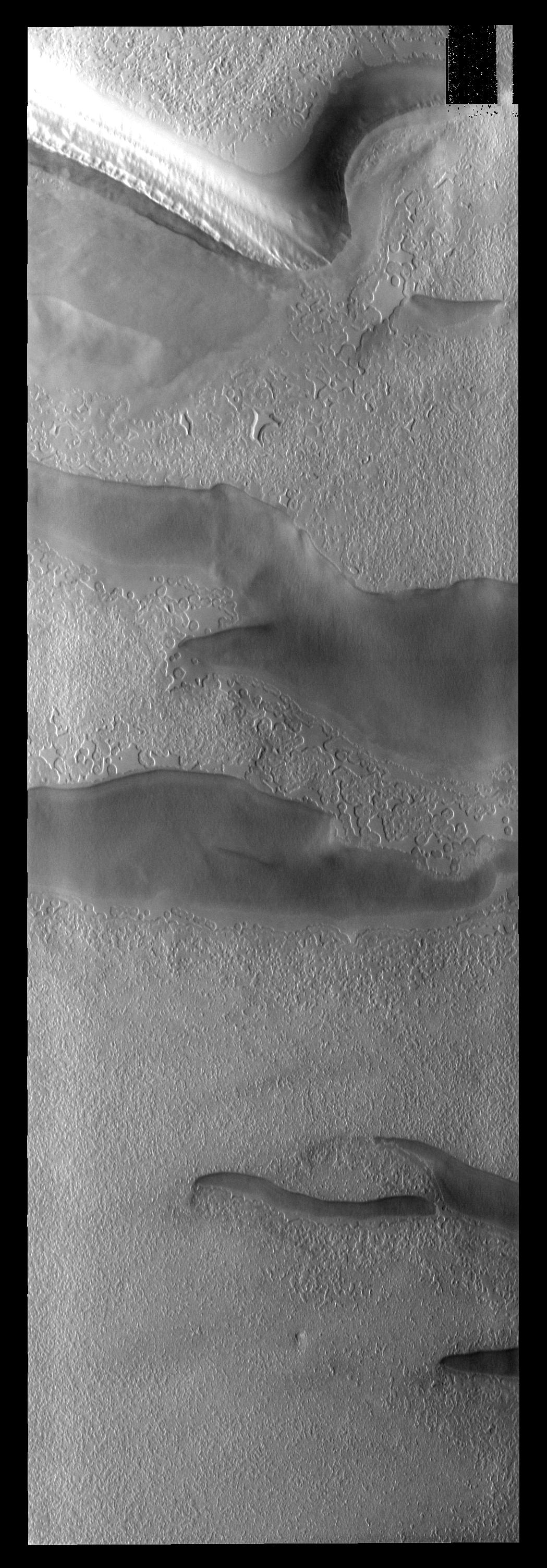 Note: this THEMIS visual image has not been radiometrically nor geometrically calibrated for this preliminary release. An empirical correction has been performed to remove instrumental effects. A linear shift has been applied in the cross-track and down-track direction to approximate spacecraft and planetary motion. Fully calibrated and geometrically projected images will be released through the Planetary Data System in accordance with Project policies at a later time.