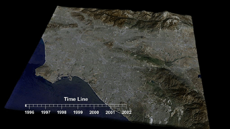 This animation depicts variations in surface elevation resulting from the discharge and recharge of groundwater basins in Southern California. These seasonal fluctuations, which range between -5 and +5 centimeters (-2 to +2 inches), result from the pumping of groundwater during the dry season (Summer/Fall) and recharge of the basins during the wet season (Winter/Spring). Reductions in elevation, resulting from extraction of groundwater, are shown in orange, while increases in elevation, resulting from the recharge of the basins, are shown in blue.