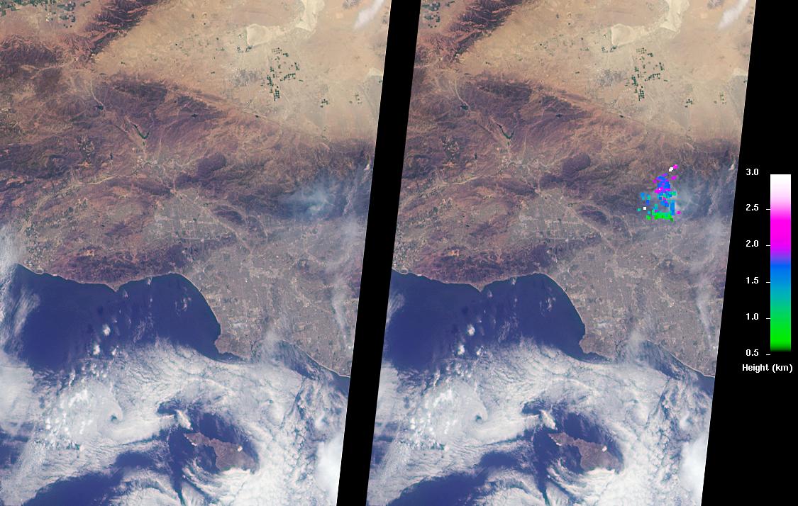 On June 21, the Multi-angle Imaging SpectroRadiometer (MISR) instrument aboard NASA's Terra satellite captured this view of the San Gabriel Mountains and Los Angeles Basin from its 46-degree forward-viewing camera, which enhances the visibility of the smoke compared to the more conventional nadir (vertical) view. The width of this image is about 75 miles (120 kilometers) across. Smoke from the San Gabriel Complex Fire is visible at the very right of the image. Stereoscopic analysis of MISR's multiple camera angles is used to compute the height of the smoke plume from the San Gabriel Complex Fire. In the right-hand image, these heights are superimposed on the underlying image. The color scale shows that the plume is not much higher than the surrounding mountains. As a result, much of the smoke is confined to the local area.