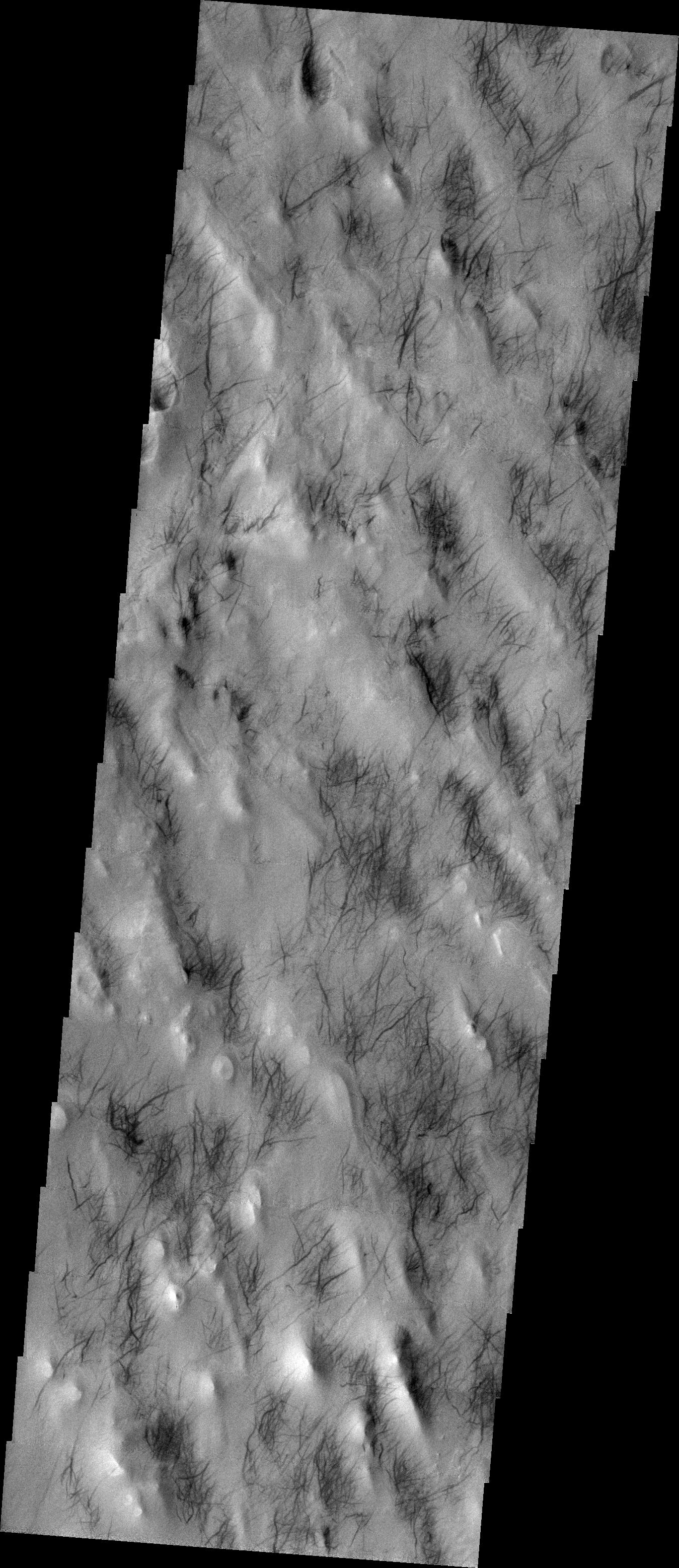 In our final dust devil image we are again looking at the southern hemisphere of Mars. These tracks occur mainly on the northeast side of the topographic ridges. Of course, there are many exceptions, which makes understanding the dynamics that initiate the actual dust devil cyclone difficult.