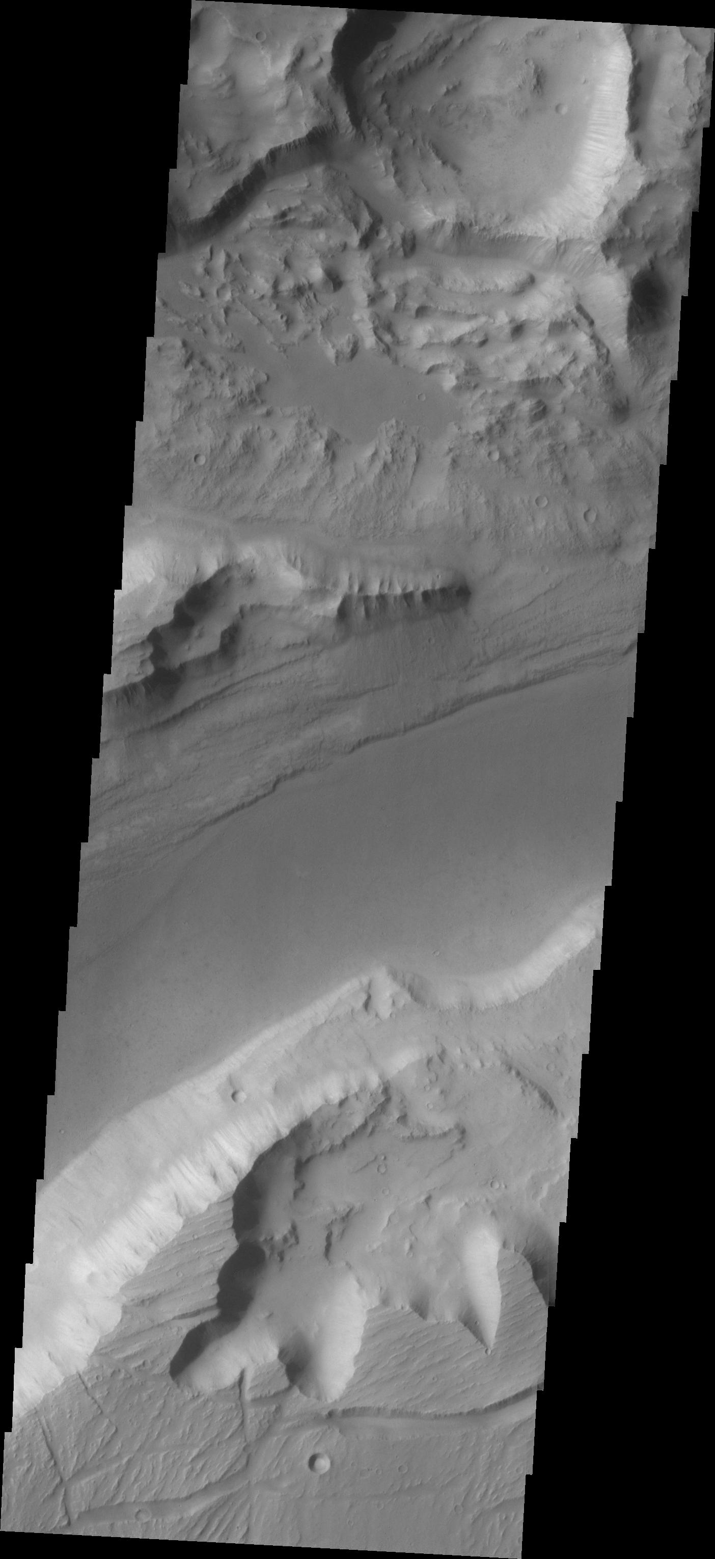 This VIS image of the southern branch of Kasei Vallis shows a complex region, with surface scour, erosion and collapse of a crater rim (top of image), and banks with differnt topography.