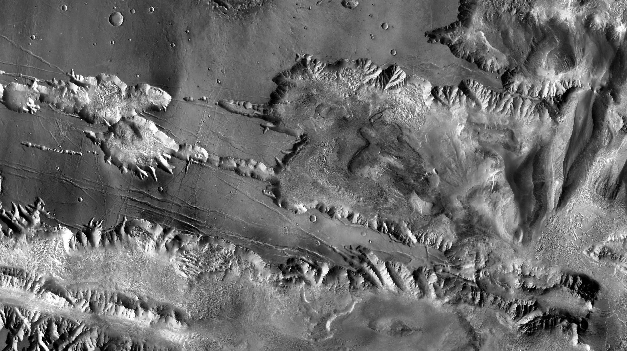 This view, covering an area approximately 580 kilometers (360 miles) wide, includes the southwestern portion of Mars's Candor Chasma, part of the large canyon system named Valles Marineris.