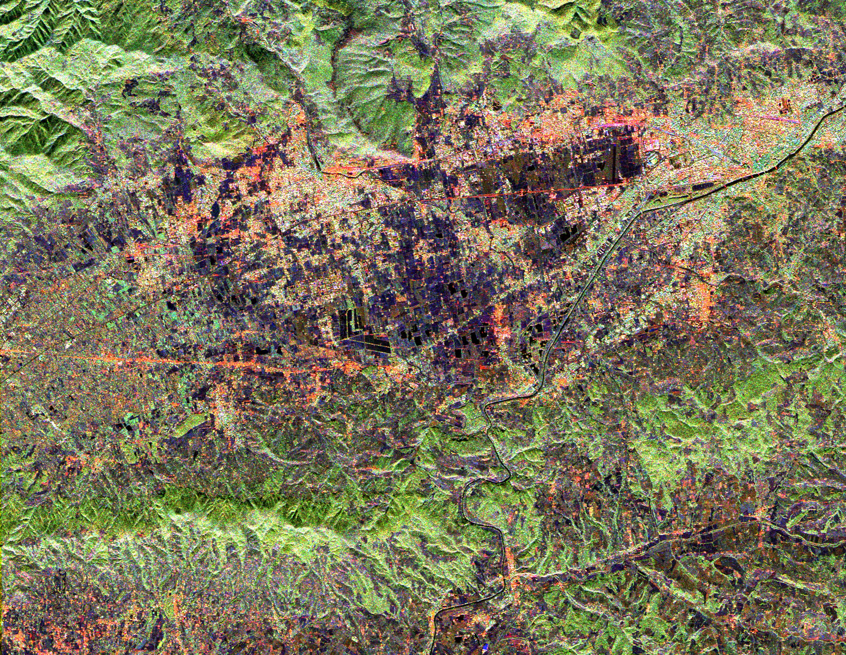 This radar image shows land use patterns in and around the city of Florence, Italy, shown here in the center of the image. Florence is situated on a plain in the Chianti Hill region of Central Italy. The Arno River flows through town and is visible as the dark line running from the upper right to the bottom center of the image. The city is home to some of the world's most famous art museums. The bridges seen crossing the Arno, shown as faint red lines in the upper right portion of the image, were all sacked during World War II with the exception of the Ponte Vecchio, which remains as Florence's only covered bridge. The large, black V-shaped feature near the center of the image is the Florence Railroad Station.