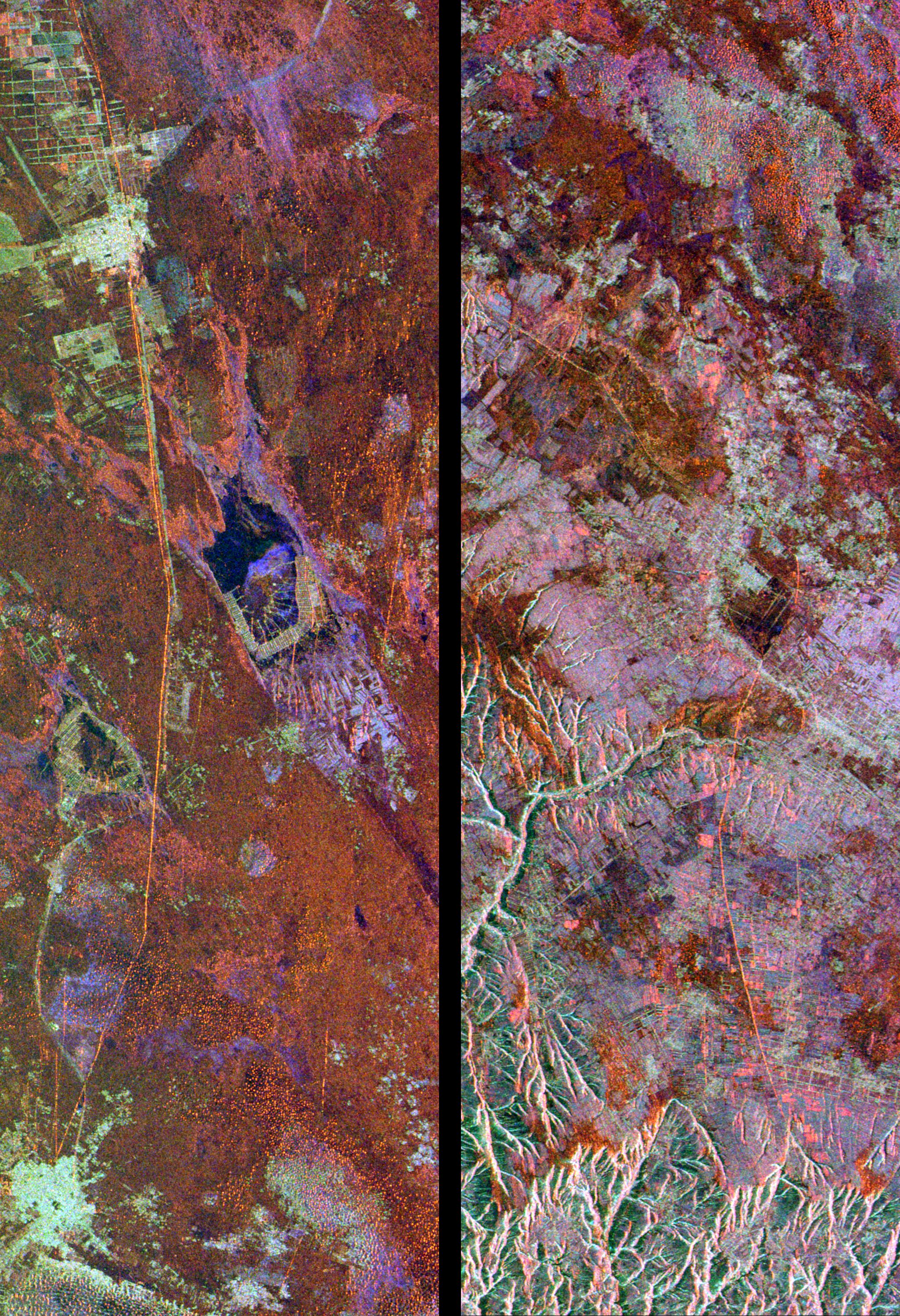 The images were acquired by the Spaceborne Imaging Radar-C/X-Band Synthetic Aperture Radar (SIR-C/X-SAR) onboard the space shuttle Endeavour on April 10, 1994. SIR-C/X-SAR, a joint mission of the German, Italian and the United States space agencies, is part of NASA's Mission to Planet Earth. The left image is centered at 37.7 degrees North latitude and 107.5 degrees East longitude. The right image is centered at 37.5 degrees North latitude and 108.1 degrees East longitude. North is toward the upper right. Each area shown measures 25 kilometers by 75 kilometers (15.5 miles by 45.5 miles). The colors in the image are assigned to different frequencies and polarizations of the radar as follows: red is L-band horizontally transmitted, horizontally received; green is L-band horizontally transmitted, vertically received; blue is C-band horizontally transmitted, vertically received.