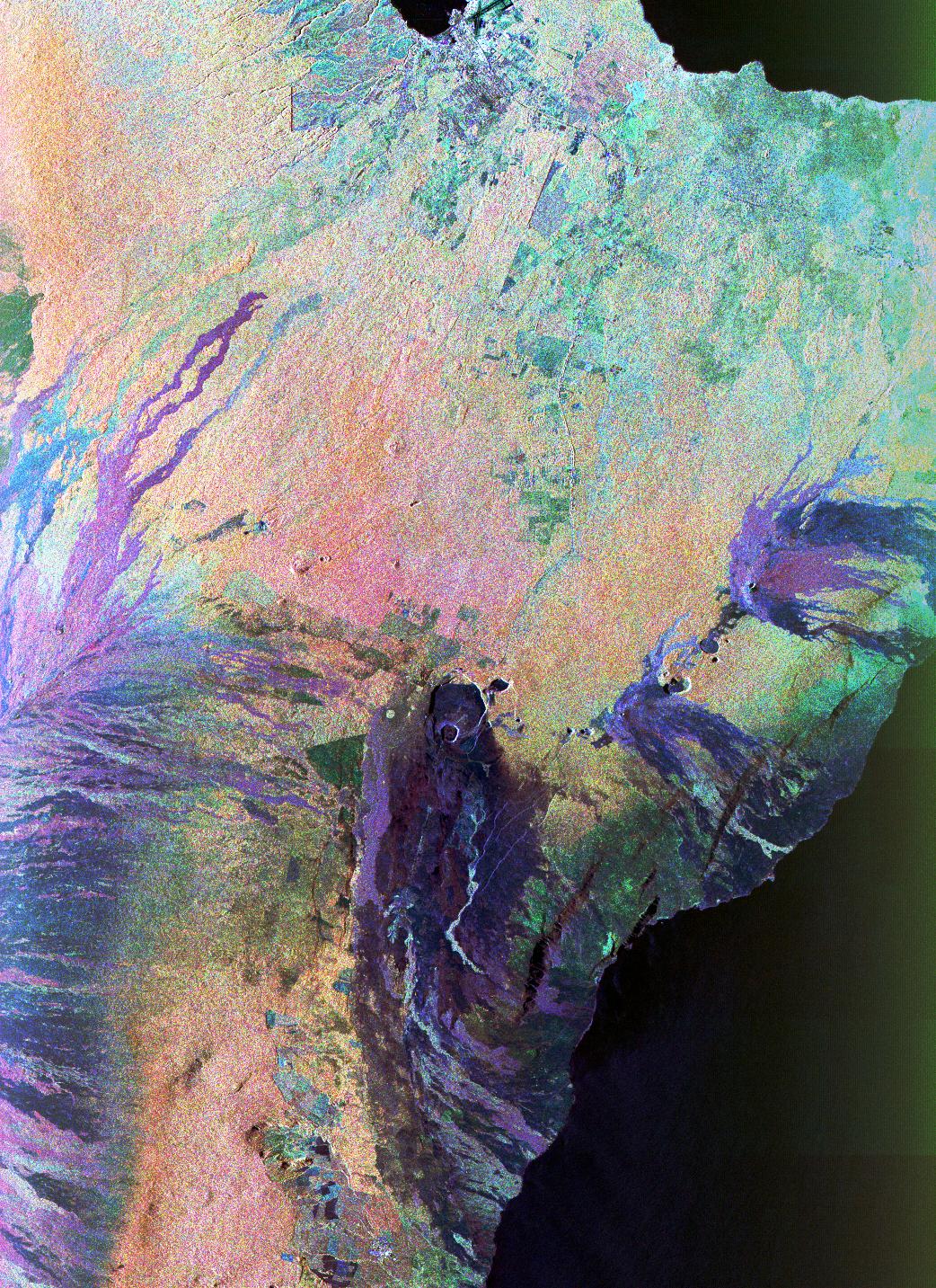 This color composite C-band and L-band image of the Kilauea volcano on the Big Island of Hawaii was acquired by the Spaceborne Imaging Radar-C/X-band Synthetic Aperture Radar (SIR-C/X-SAR) flying on space shuttle Endeavour. The city of Hilo can be seen at the top. The image shows the different types of lava flows around the crater Pu'u O'o. Ash deposits which erupted in 1790 from the summit of Kilauea volcano show up as dark in this image, and fine details associated with lava flows which erupted in 1919 and 1974 can be seen to the south of the summit in an area called the Ka'u Desert. In addition, the other historic lava flows created in 1881 and 1984 from Mauna Loa volcano (out of view to the left of this image) can be easily seen despite the fact that the surrounding area is covered by forest. Such information will be used to map the extent of such flows, which can pose a hazard to the subdivisions of Hilo. Highway 11 is the linear feature running from Hilo to the Kilauea volcano. The Kilauea volcano has been almost continuously active for more than the last 11 years. Field teams that were on the ground specifically to support these radar observations report that there was vigorous surface activity about 400 meters (one-quarter mile) inland from the coast. A moving lava flow about 200 meters (660 feet) in length was observed at the time of the shuttle overflight, raising the possibility that subsequent images taken during this mission will show changes in the landscape. This image is centered at 19.2 degrees north latitude and 155.2 degrees west longitude.