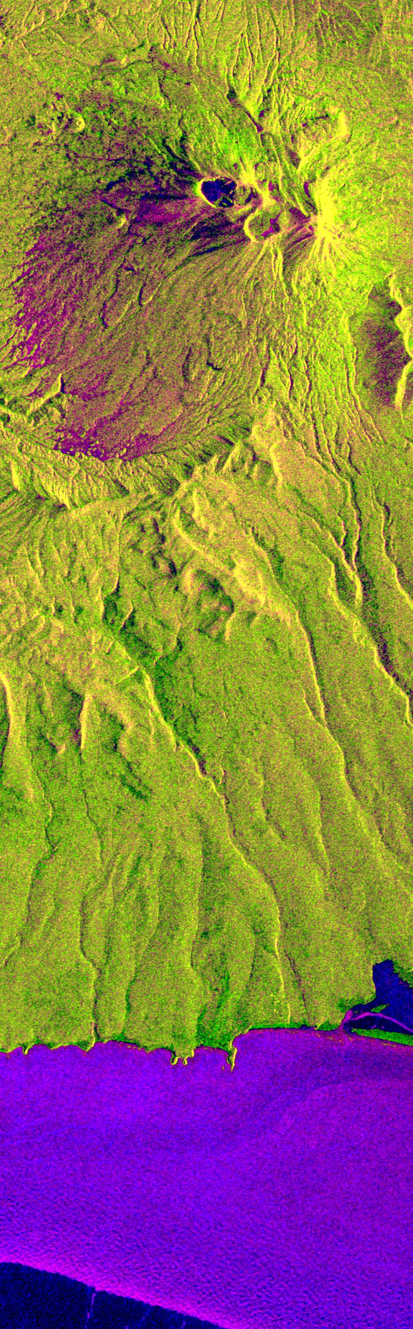 Kamchatka is twice as large as England, Scotland and Wales combined and is home to approximately 470,000 residents. The region is characterized by a chain of volcanoes stretching 800 kilometers (500 miles) across the countryside. Many of the volcanoes, including the active Maly Semlyachik volcano in this image, have erupted during this century. But the most active period in creating the three characteristic craters of this volcano goes back 20,000, 12,000 and 2,000 years ago. The highest summit of the oldest crater reaches about 1,560 meters (1,650 feet). The radar images reveal the geological structures of craters and lava flows in order to improve scientists' knowledge of these sometimes vigorously active volcanoes. This seasonal composite also highlights the ecological differences that have occurred between April and October 1994. In April the whole area was snow-covered and, at the coast, an ice sheet extended approximately 5 kilometers (3 miles) into the sea. The area shown surrounding the volcano is covered by low vegetation much like scrub. Kamchatka also has extensive forests, which belong to the northern frontier of Taiga, the boreal forest ecosystem. This region plays an important role in the world's carbon cycle. Trees require 60 years to mature in Kamchatka's 120-day growing season. The forest industry is managing these forests and practicing selective cutting to allow younger trees time to grow and reseed. X-SAR images will aid in mapping these deforested areas and in encouraging further recultivation efforts.