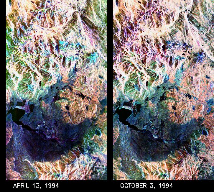 The image at right was acquired on October 3, 1994, on the space shuttle Endeavour's 67th orbit of the second radar mission. Crowley Lake appears dark at the center left of the image, just above or south of Long Valley. The Mammoth Mountain ski area is visible at the top right of the scene. The red areas correspond to forests, the dark blue areas are bare surfaces and the green areas are short vegetation, mainly brush. The changes in color tone at the higher elevations (e.g. the Mammoth Mountain ski area) from green-blue in April to purple in September reflect changes in snow cover between the two missions.