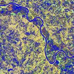 The image shows one such levee break near Glasgow, Missouri. In the upper center of the radar image is a region covered by several meters of sand, shown as blue regions below the bend in the river. West (left) of this dark area, a blue gap in the levee tree canopy can be seen, showing the area where the levee failed. Radar data such as these can help scientists more accurately assess the potential for future flooding in this region and how that might impact surrounding communities.