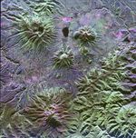 A family of dormant volcanoes dominates the landscape in this radar image of the Andes Mountains in northern Ecuador. The city of Otavalo, shown in pink, and Lake Otavalo lie within the triangle formed by three volcanoes in the upper part of the image. These volcanoes are, clockwise from upper left, Mojanda, Imabura and Cusin. A lake partially fills the summit crater of Mojanda and a group of lava domes can be seen on the north flank. Geologists believe the most recent eruption of Mojanda was about 3,400 years ago. Much more recent activity has occurred at Cayambe, the large volcano at the bottom of the image. Massive mudflow deposits can be seen filling the valleys on the east (right) side of Cayambe. Cayambe last erupted about 600 years ago. Geologists are using radar to study volcanoes in the Andes to determine the history of eruptions and to identify potential threats the volcanoes pose to local communities.