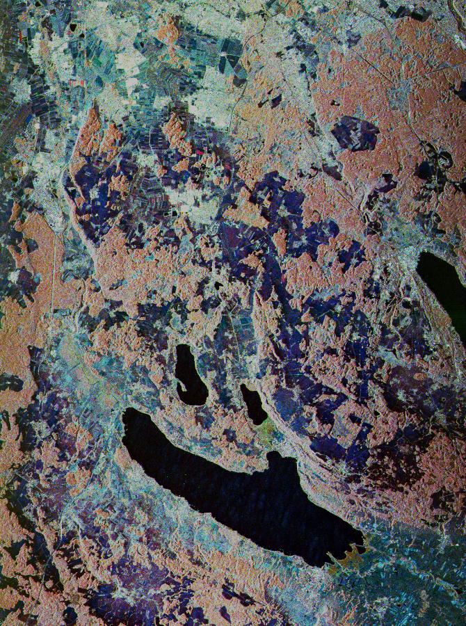 The Oberpfaffenhofen supersite is the major test site for X-SAR calibration and scientific experiments such as ecology, hydrology and geology. This color composite image is a three-frequency overlay. L-band total power was assigned red, the C-band total power is shown in green and the X-band VV polarization appears blue. The colors on the image stress the differences between the L-band, C-band and X-band images. If the three frequencies were seeing the same thing, the image will appear in black and white. For example, the blue areas corresponds to area for which the X-band backscatter is relatively higher than the backscatter at L-and C-band; this behavior is characteristic of clear cuts or shorter vegetation. Similarly, the forested areas have a reddish tint. Finally, the green areas seen at the southern tip of both the Ammersee and the Pilsensee lakes indicate a marshy area.
