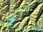 This is a digital elevation model that was geometrically coded directly onto an X-band seasonal change image of the Oetztal supersite in Austria. The image is centered at 46.82 degrees north latitude and 10.79 degrees east longitude. This image is located in the Central Alps at the border between Switzerland, Italy and Austria, 50 kilometers (31 miles) southwest of Innsbruck. It was acquired by the Spaceborne Imaging Radar-C/X-band Synthetic Aperture aboard the space shuttle Endeavour on April 14, 1994 and on October 5, 1994. It was produced by combining data from these two different data sets. Data obtained in April is green; data obtained in October appears in red and blue, and was used as an enhancement based on the ratio of the two data sets. Areas with a decrease in backscatter from April to October appear in light blue (cyan), such as the large Gepatschferner glacier seen at the left of the image center, and most of the other glaciers in this view. A light blue hue is also visible at the east border of the dark blue Lake Reschensee at the upper left side. This shows a significant rise in the water level. Magenta represents areas with an increase of backscatter from April 10 to October 5. Yellow indicates areas with high radar signal response during both passes, such as the mountain slopes facing the radar. Low radar backscatter signals refer to smooth surface (lakes) or radar grazing areas to radar shadow areas, seen in the southeast slopes. The area is approximately 29 kilometers by 21 kilometers (18 miles by 13.5 miles). The summit of the main peaks reaches elevations of 3,500 to 3,768 meters (xx feet to xx feet) above sea level. The test site's core area is the glacier region of Venter Valley, which is one of the most intensively studied areas for glacier research in the world. Research in Venter Valley (below center) includes studies of glacier dynamics, glacier-climate regions, snowpack conditions and glacier hydrology. About 25 percent of the core test site is covered by glaciers. Corner reflectors are set up for calibration. Five corner reflectors can be seen on the Gepatschferner and two can be seen on the Vernagtferner.