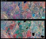 In late September and early October, the boreal forest experiences a relatively different seasonal change. At this time, the leaves on deciduous trees start changing color and dropping off. The soil and trees are quite often moist due to frequent rainfall and cloud cover. The evaporation of moisture and carbon dioxide into the atmosphere also diminishes at this time. SIR-C/X-SAR is sensitive to the moisture of soil and vegetation and can sense this freeze-thaw cycle and the summer-fall seasonal transition over forested areas in particular. Optical sensors, by contrast, are blind to these regions, which are perpetually obscured by thick cloud cover. These changes were detected by comparing the April and October color composite images of L-band data in red, C-band data in green and X-band (vertically received and transmitted) in blue. The changes in intensity of each color over lakes, various forest stands and clear cuts in the two images is striking. Lakes such as Lake Heiberg, Crabtree Lake and Williams Lake, in the right middle part of the image, are frozen in April (appearing in bright blue) and melted (appearing in black) in October. The higher intensity of blue over lakes in April is due to low penetration of the X-band (vertically received and transmitted) and the radar's high sensitivity to surface features. Forest stands also exhibit major changes between the two images. The red areas in the October image are old jack pine canopies that cause higher return at L-band because of their moist condition in late summer compared to their partially frozen condition in April (in purple). Similarly, in the areas near the middle of the image, where black spruce and mixed aspen and jack pine trees dominate, the contrast between blue in October and red and green in April is an indication that the top of the canopy (needles and branches) were frozen in April and moist in October. The changes due to deforestation by logging companies or natural fires can also be detected by comparing the images. For example, the small blue area near the intersection of Harding Road and Highway 120 is the result of logging which occurred after the April data was acquired. The surface area of clear cut is approximately 4 hectares, which is calculated from the high-resolution capability of the radar images and verified by scientists participating in field work during the mission.