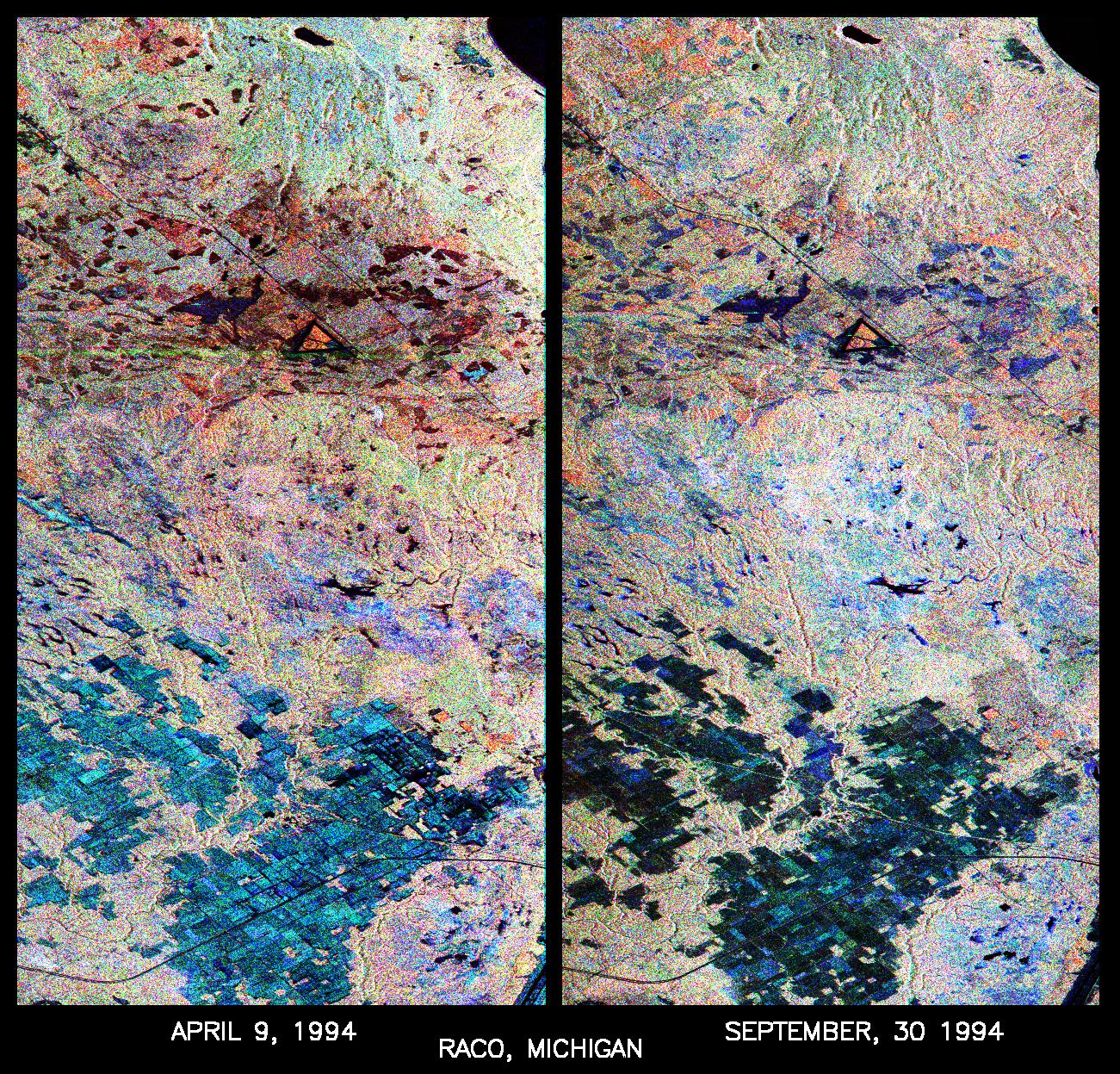 The images were acquired by the Spaceborne Imaging Radar-C and X-band Synthetic Aperture Radar (SIR-C/X-SAR) aboard the shuttle Endeavour on the sixth orbit of each mission. In these images, red is L-band (23 cm) with horizontal/vertical polarization; green is C-band (6 cm) with horizontal/vertical polarization; blue is C-band with horizontal/horizontal polarization. The region shown is largely forested and includes a large portion of Hiawatha National Forest, as well as an agricultural region near the bottom of each image. In early April, the area was snow-covered with up to 50 centimeters (19.5 inches) of snow in forest clearings and agricultural fields. Buds had not yet broken on deciduous trees, but the trees were not frozen and sap was generally flowing. Lake Superior, in the upper right, and the small inland lakes were frozen and snow-covered on April 9, 1994. By the end of September, deciduous trees were just beginning to change color after a relatively wet period. Leaf loss was estimated at about 30 percent, depending on the species, and the soil was moist to wet after a heavy rainfall on September 28, 1994. Most agricultural fields were covered with grasses of up to 60 centimeters (23 inches) in height.