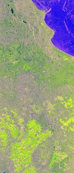 The areas shown in red correspond to the April 10th data; the areas in blue correspond to data acquired on October 1, 1994; green indicates the ratio of data acquired on April 10 and October 1, 1994. The area shown is 22.7 kilometers by 53 kilometers (14 miles by 33 miles). Lake Superior in the upper right was frozen in April and had small waves (ripples) on its surface in October. The land area contains mostly forests and, to a lesser extent, agricultural regions. In April the area was covered in wet snow. By October, there agricultural areas were covered with grass. Vegetation and soils were moist due to rainfalls three days before the data was acquired on October 1, 1994.