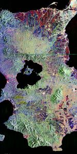 This is an image of Taal volcano, near Manila on the island of Luzon in the Philippines. The black area in the center is Taal Lake, which nearly fills the 30-kilometer-diameter (18-mile) caldera. The caldera rim consists of deeply eroded hills and cliffs. The large island in Taal Lake, which itself contains a crater lake, is known as Volcano Island. The bright yellow patch on the southwest side of the island marks the site of an explosion crater that formed during a deadly eruption of Taal in 1965.