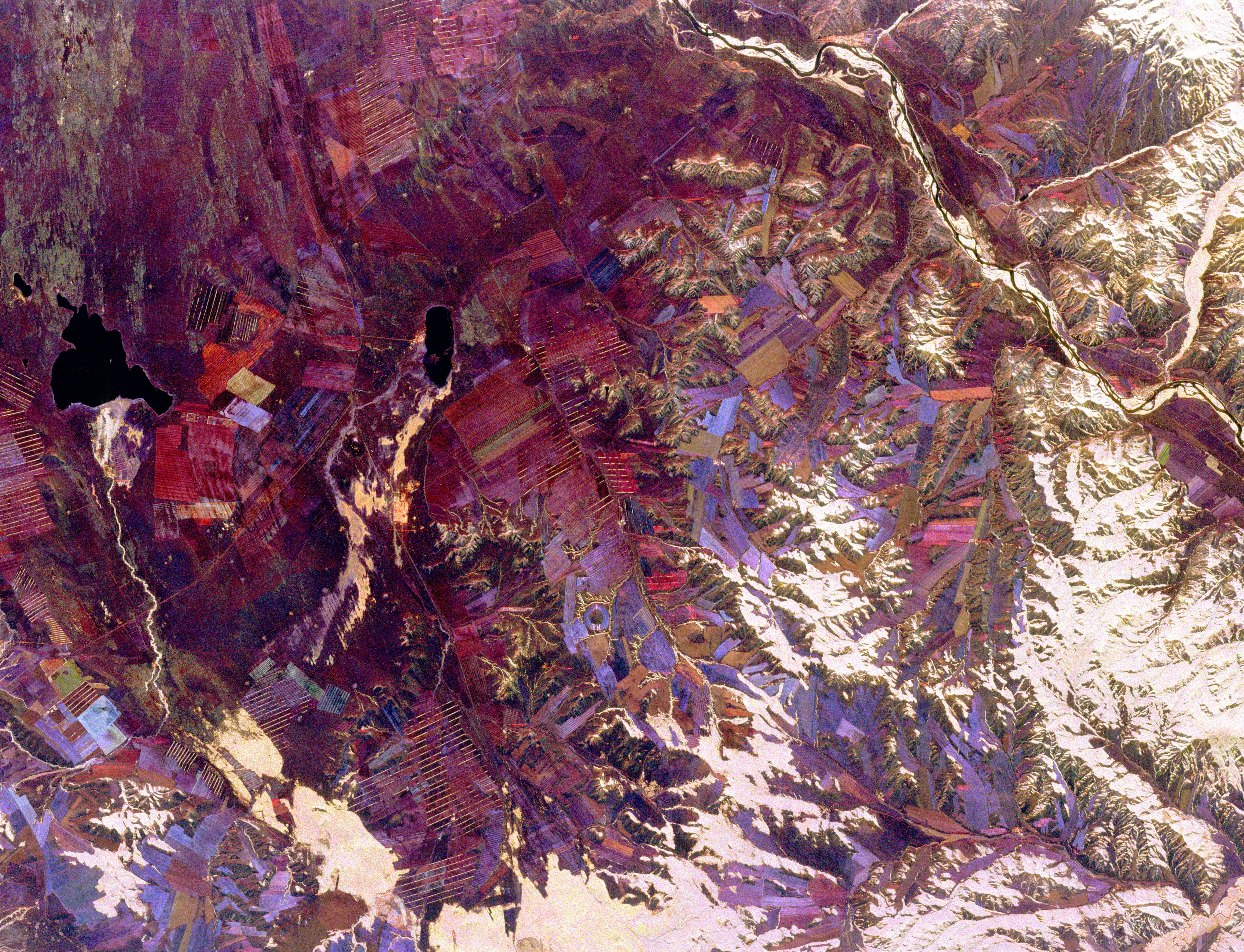 This spaceborne radar image shows part of the remote central Asian region of Tuva, an autonomous republic of the Russian Federation. Tuva is a mostly mountainous region that lies between western Mongolia and southern Siberia. This image shows the area just south of the republic's capital of Kyzyl. Most of the red, pink and blue areas in the image are agricultural fields of a large collective farming complex that was developed during the era of the Soviet Union. Traditional agricultural activity in the region, still active in remote areas, revolves around practices of nomadic livestock herding. White areas on the image are north-facing hillsides, which develop denser forests than south-facing slopes. The river in the upper right is one of the two major branches of the Yenesey River. Tuva has received some notoriety in recent years due to the intense interest of the celebrated Caltech physicist Dr. Richard Feynman, chronicled in the book "Tuva or Bust" by Ralph Leighton.