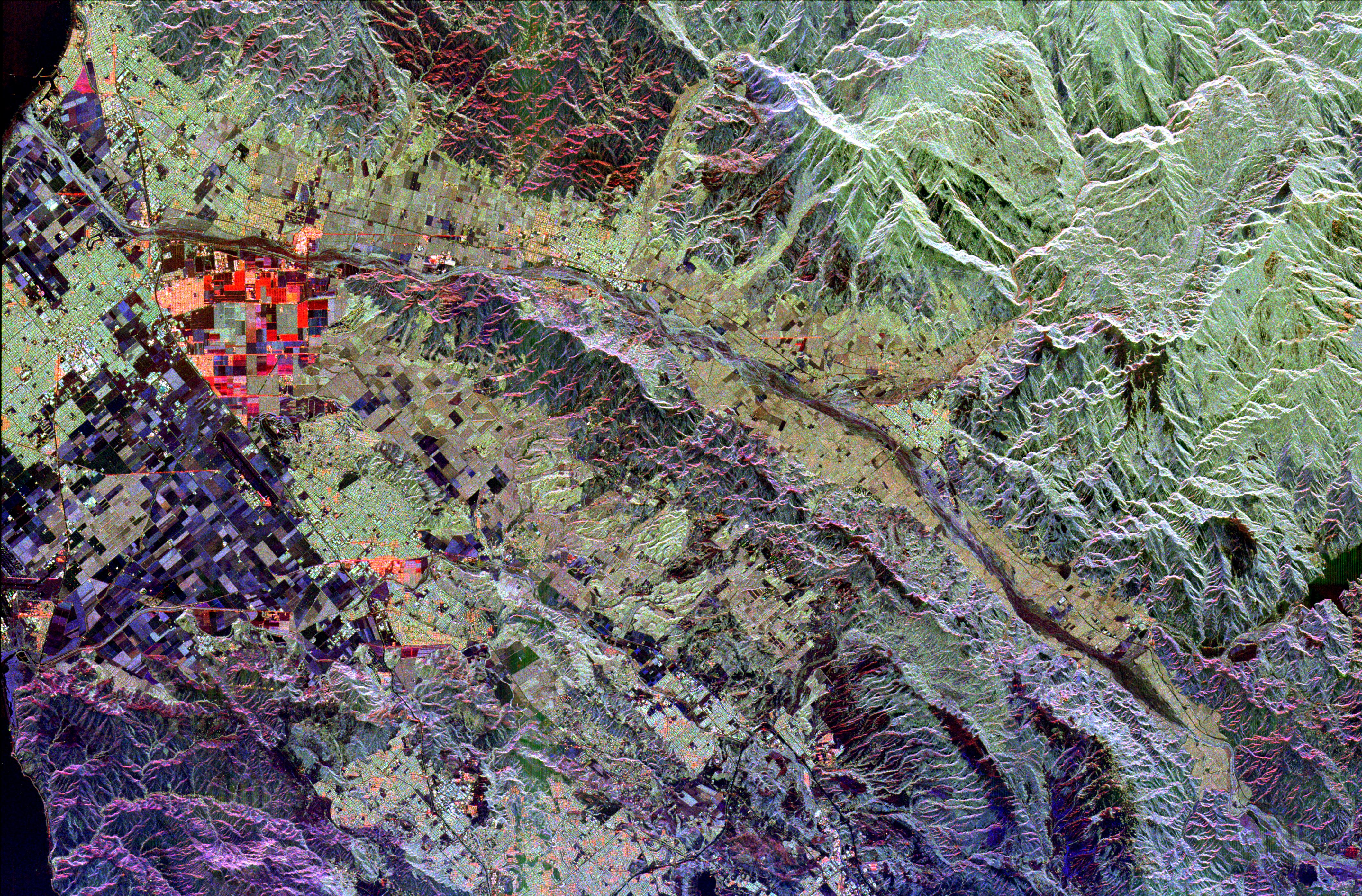 This radar image of Ventura County, California, shows the Santa Clara River valley and the surrounding mountains. The river valley is the linear feature that extends from the lower right to the upper left (east to west), where it empties into the Pacific Ocean (dark patches in upper and lower left). The cities of Ventura and Oxnard are seen along the left side of the image. Simi Valley is located in the lower center of the image, between the Santa Monica Mountains (purple area in lower left) and the Santa Susanna Mountains to the north. This area of California is known for its fruit; strawberry fields are shown in red and purple rectangular areas on the coastal plain, and citrus groves are the yellow green areas adjacent to the river. This image is centered at 34.33 degrees north latitude, 119 degrees west longitude. The area shown is approximately 53 kilometers by 35 kilometers (33 miles by 22 miles). Colors are assigned to different radar frequencies and polarizations as follows: red is L-band, horizontally transmitted, horizontally received; green is L-band, horizontally transmitted, vertically received; blue is C-band, horizontally transmitted, vertically received.