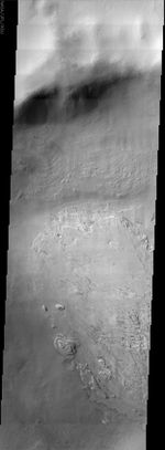 The craters on Mars display a variety of interior deposits one of which is shown here. Spallanzani Crater is located far enough south that it probably experiences the seasonal growth and retreat of the south polar cap. During the southern hemisphere winter, CO2 frost condenses out of the atmosphere onto the surface and probably brings with it small amounts of dust and even water ice. It is this sort of depositional process that is thought to have produced the polar layered deposits. The layered deposit in Spallanzani Crater shares some similarities with the polar deposits. Whatever the origin of the layered materials, they likely filled the crater at one time. Note how the interior slope of the northern rim displays layered material of similar if less distinct morphology as the main deposit on the floor. The process that filled the crater with sediment has been replaced by the opposite process. Erosion has taken over, leaving behind spectacular stair-stepped mesas and bizarre, contorted landforms. Unlike the interior crater deposits in the equatorial latitudes, the erosional process has not produced the yardang features that indicate wind erosion. It may be that ice was one of the cementing agents of the sediment and perhaps the sublimation of that ice has left the sediment susceptible to erosion. The details of the deposition and erosion of this interesting deposit remain to be discovered.