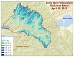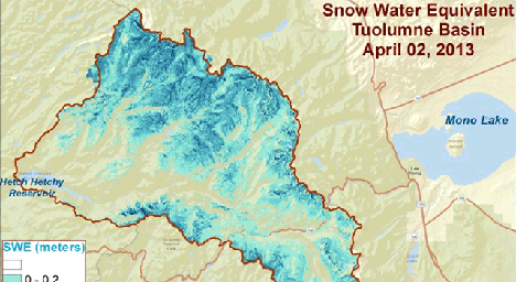 Spatial distribution of snow water equivalent across the Tuolumne River Basin from April 10 to June 1, 2013 as measured by NASA's Airborne Snow Observatory.