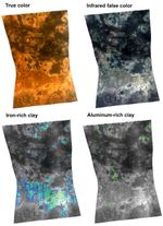 This image includes four renderings of the data, all map-projected. At top left is an approximately true-color representation. At top right is false color showing brightness of the surface at selected infrared wavelengths. In the two bottom views, brightness of the surface at different infrared wavelengths has been compared to laboratory measurements of minerals, and regions that match different minerals have been colored. The bottom left image shows areas high in iron-rich clay, and the bottom right image shows areas high in aluminum-rich clay.
