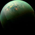 The view contains real color information, although it is not the natural color the human eye would see. Here, red in the image corresponds to 5.0 microns, green to 2.0 microns, and blue to 1.3 microns. These wavelengths correspond to atmospheric windows through which Titan's surface is visible. The unaided human eye would see nothing but haze, as in PIA12528.