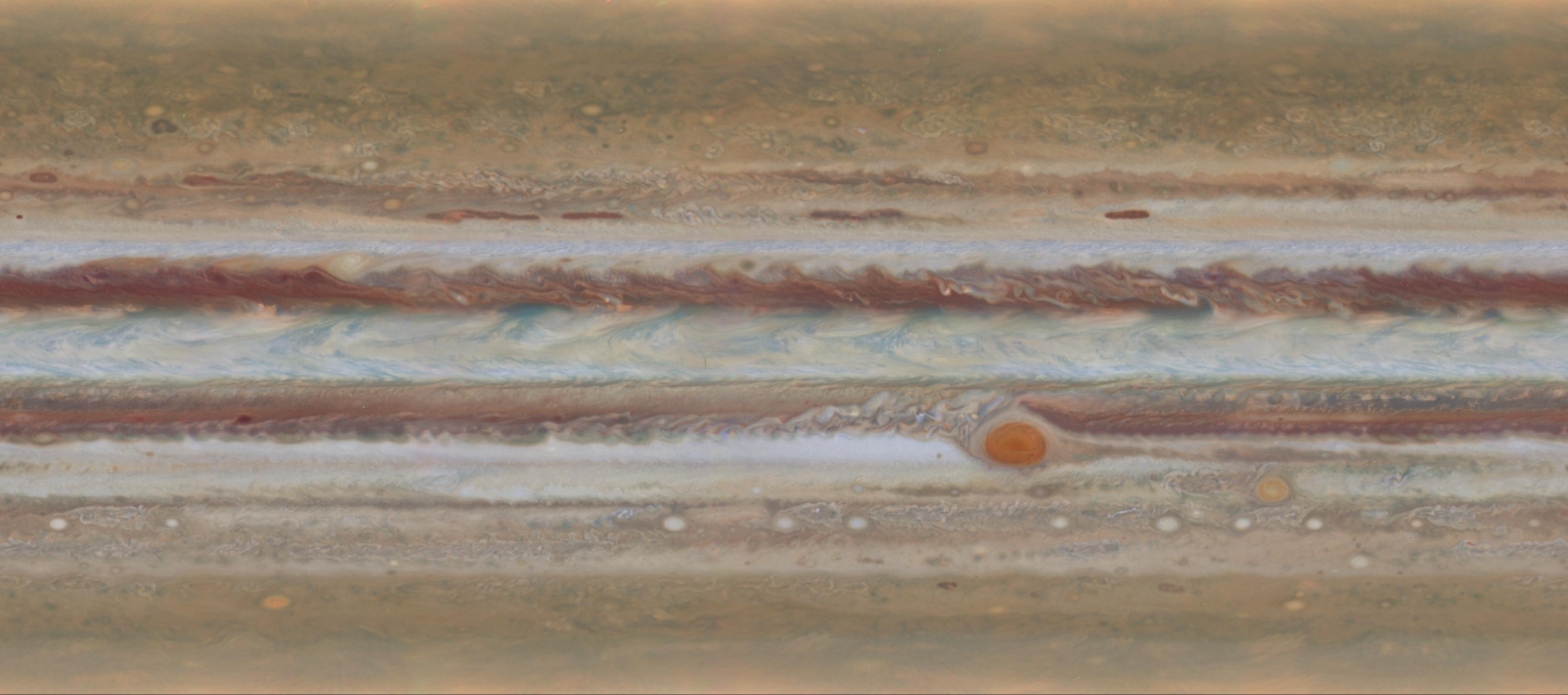 Scientists produced new global maps of Jupiter using the Wide Field Camera 3 on NASA's Hubble Space Telescope. One color map is shown here, projected onto a globe and as a flat image.