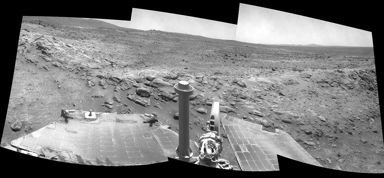 NASA's Mars Exploration Rover Spirit used its navigation camera to take the images assembled into this stereo, 120-degree view southward after a short drive during the 1,809th Martian day, or sol, of Spirit's mission on the surface of Mars (February 3, 2009).