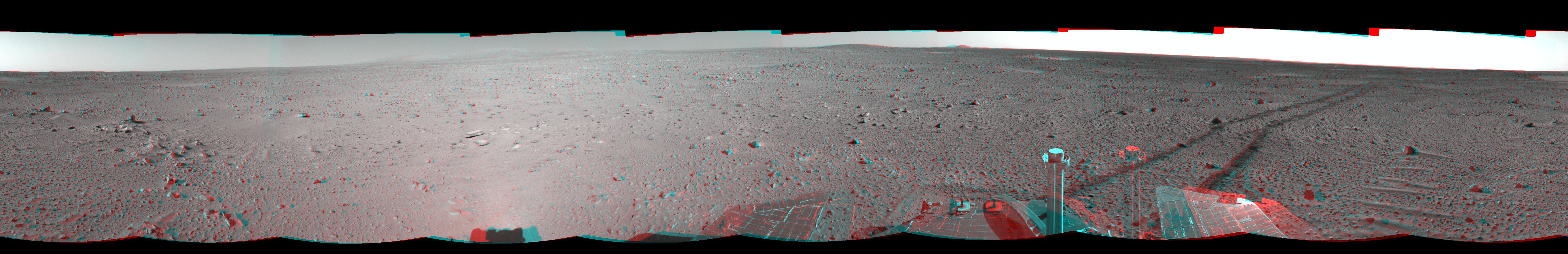 This three-dimensional view in a cylindrical-perspective projection was created from navigation camera images that NASA's Mars Exploration Rover Spirit acquired on sol 121 (May 6, 2004). Continuing its trek toward the "Columbia Hills," Spirit drove 96.8 meters (318 feet) -- half of which was performed in auto-navigation mode -- and broke its record for the longest distance traveled in one sol. That drive brought the mission total to 1,669 meters (1.04 miles), flipping the rover's odometer over the one-mile mark.