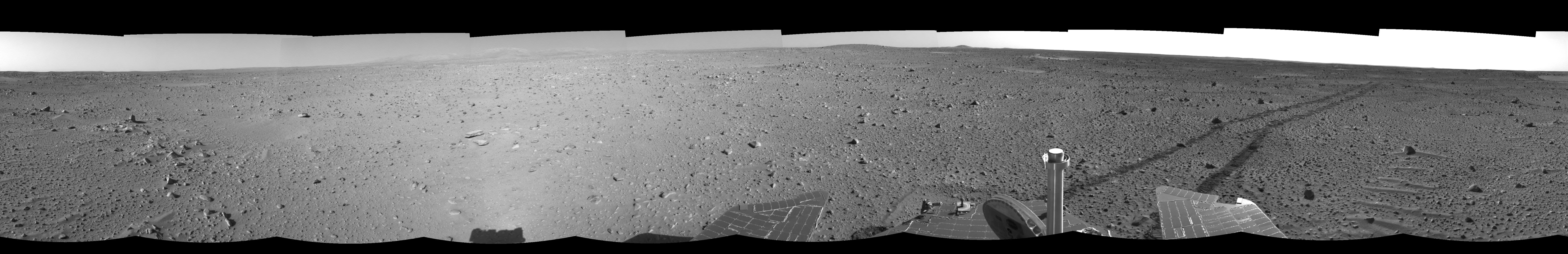This right eye of a stereo pair of views in a cylindrical-perspective projection was created from navigation camera images that NASA's Mars Exploration Rover Spirit acquired on sol 121 (May 6, 2004). Continuing its trek toward the "Columbia Hills," Spirit drove 96.8 meters (318 feet) -- half of which was performed in auto-navigation mode -- and broke its record for the longest distance traveled in one sol. That drive brought the mission total to 1,669 meters (1.04 miles), flipping the rover's odometer over the one-mile mark.